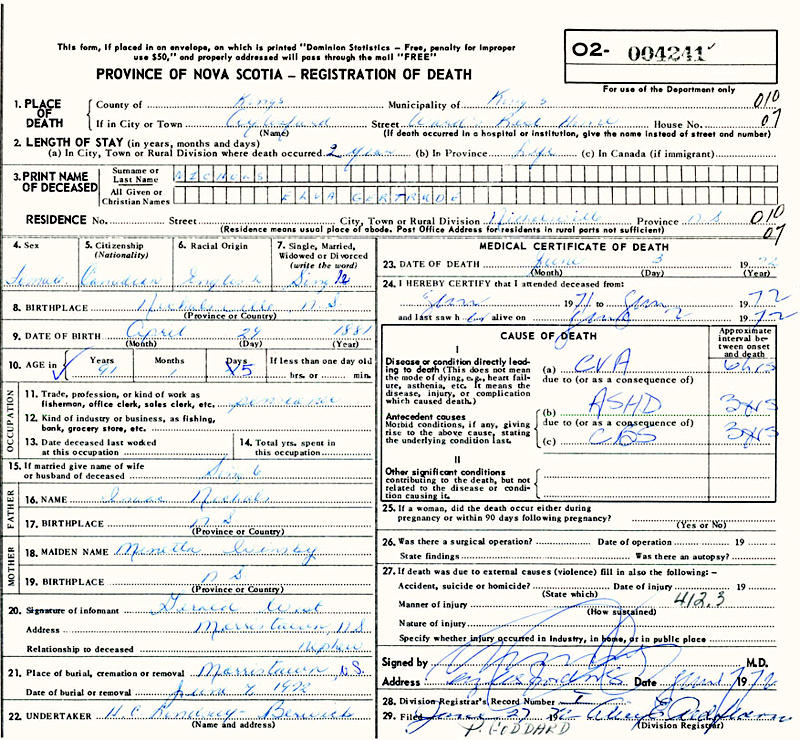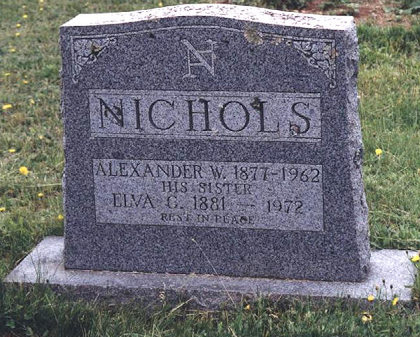Parents Father: NICHOLS, Isaac Mother: WINSBY, Minetta Eleanor Birth Born on April 29, 1881 in Nicholsville, Kings Co., NS Death Died on June 03, 1972 in Aylesford, Kings Co., NS Buried in Morristown Cemetery in Morristown, Kings Co., NS Notes Death: Cerebrovascular Accident Sources Nova Scotia Deaths: Year 1972 #4241 Images Alexander & Elva Nichols Elva Nichols Death