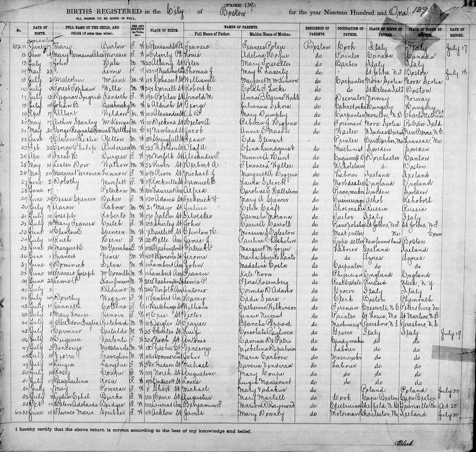 Birth Born on July 03, 1901 in Boston, Suffolk Co., MA Death Died on February 15, 1970 in Medfield, Norfolk Co., MA Marriages NICHOLS, Mabel Eleanor Married on 1947 in Massachusetts, USA Notes Occupation: Shipper/ Carpenter Sources Massachusetts Deaths: #5694 Images Forest Wills Birth