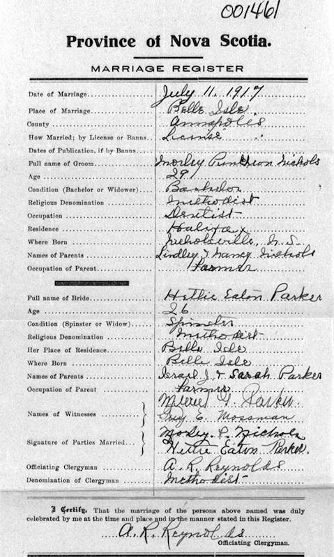Parents Father: NICHOLS, Lindley Moore Mother: BENT, Nancy M. Birth Born on July 06, 1888 in Nicholsville, Kings Co., NS Death Died on February 18, 1953 in Nicholsville, Kings Co., NS Buried in Aylesford Union Cemetery in Aylesford, Kings Co., NS Marriages PARKER, Hettie Eaton Married on July 11, 1917 in Belleisle, Annapolis Co., NS Children NICHOLS, Frances LaVaughn: June 18, 1919 NICHOLS, Phyllis Jeanette: June 01, 1922 - July 18, 2014 NICHOLS, Thelma Bernice: March 22, 1926 - April 09, 2009 Notes Occupation: Dentist Death: Coronary Thrombosis Sources Nova Scotia Deaths: Year 1953 #1884 Images Morley Nichols Death Morley Nichols Marriage