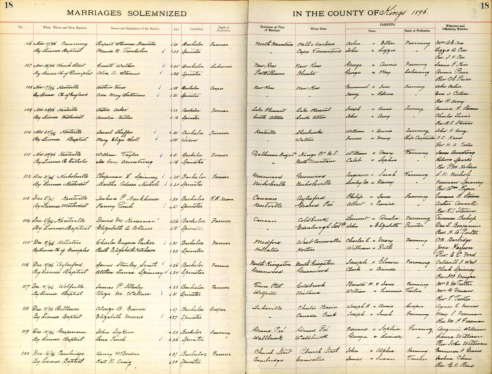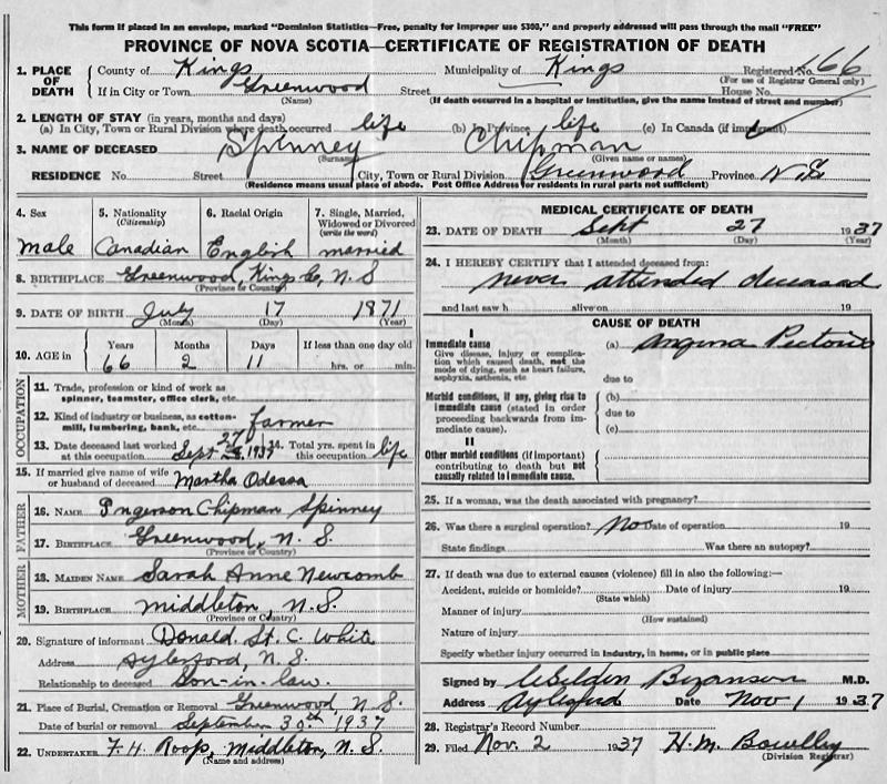 Birth Born on July 17, 1871 in Aylesford, Kings Co., NS Death Died on September 27, 1937 in Greenwood, Kings Co., NS Buried in Greenwood Union Church Cemetery in Greenwood, Kings Co., NS Marriages NICHOLS, Martha Odessa Married on December 02, 1896 in Nicholsville, Kings Co., NS Children SPINNEY, Bessie Vonetta: May 24, 1897 - May 10, 1965 SPINNEY, Erdeena Bernice: October 02, 1900 - March 31, 1959 SPINNEY, Muriel Odessa: February 13, 1907 - May 19, 2010 SPINNEY, Clinton Moore: January 23, 1915 - March 05, 1994 Notes Occupation: Farmer Death: Angina pectoris Sources Nova Scotia Deaths: Year 1937 File 173 #166 Images Chipman Spinney Birth Chipman & Martha (Nichols) Spinney Chipman Spinney Death Martha Nichols Marriage