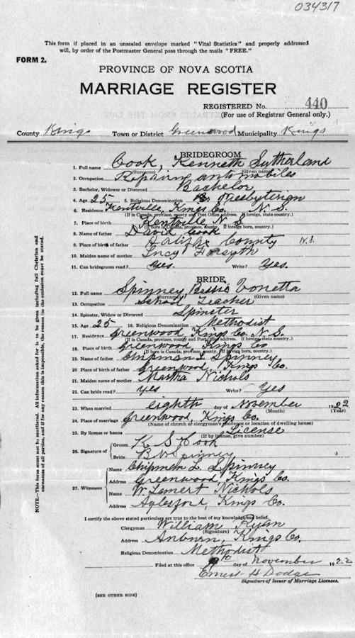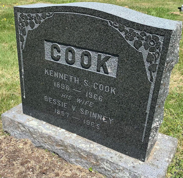 Parents Father: SPINNEY, Chipman LaVerne Mother: NICHOLS, Martha Odessa Birth Born on May 24, 1897 in Greenwood, Kings Co., NS Death Died on May 10, 1965 in Kentville, Kings Co., NS Buried in Elm Grove Cemetery in Steam Mill, Kings Co., NS Marriages COOK, Kenneth Sutherland Married on November 08, 1922 in Greenwood, Kings Co., NS Children COOK, Pansy Marie: 1925 - 1982 COOK, Helen Joyce: 1928 - 1976 Notes Occupation: Teacher Death: Myocardial Infarction Sources Nova Scotia Deaths: Year 1965 #3393 Images Kenneth & Bessie (Spinney) Cook Bessie (Spinney) Cook Death Bessie Spinney Marriage