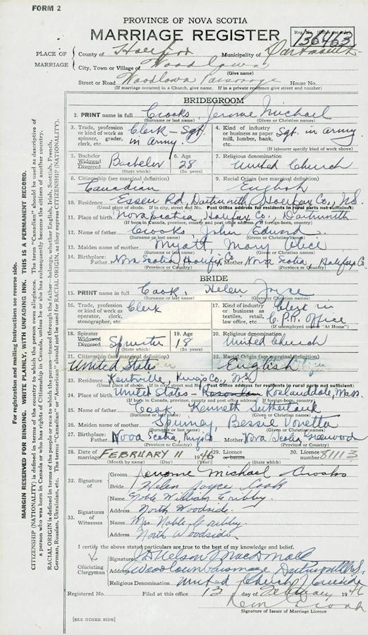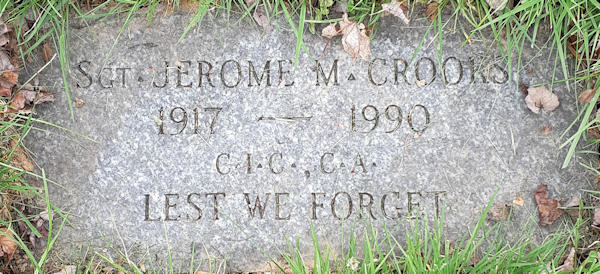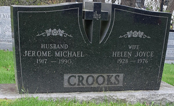Birth Born on 1917 in Dartmouth, Halifax Co., NS Death Died on 1990 in Dartmouth, Halifax Co., NS Buried in Woodlawn Cemetery in Dartmouth, Halifax Co., NS Marriages COOK, Helen Joyce Married on February 11, 1946 in Woodlawn, Dartmouth, Halifax Co., NS Notes Military Service: WW2 RC Army Clerk Sergeant Sources Halifax Co. Cemetery Records: Woodlawn Cemetery Dartmouth,NS Images Jerome & Helen (Cook) Crooks Jerome Crooks Helen Cook Marriage