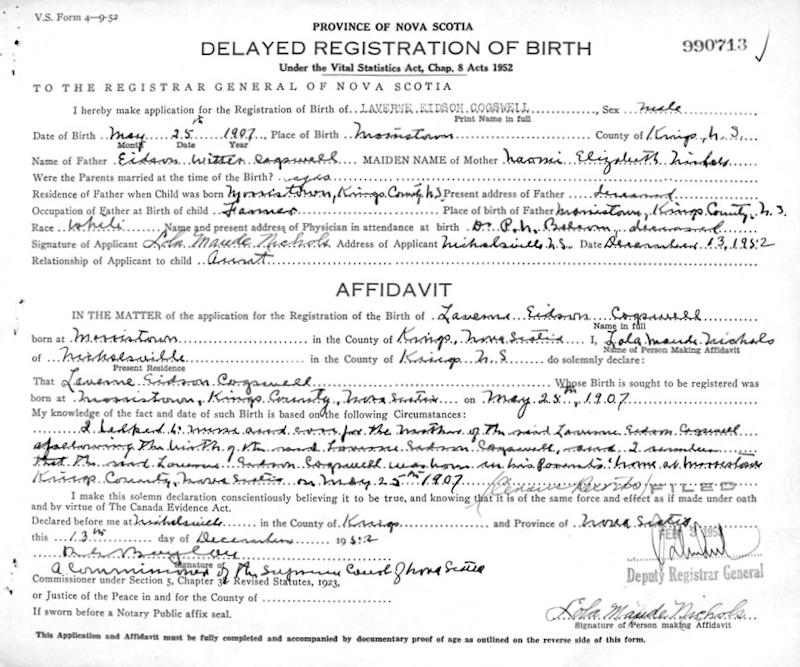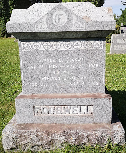 Parents Father: COGSWELL, Eidson Witter Mother: NICHOLS, Naomi Elizabeth Birth Born on May 25, 1907 in Morristown, Kings Co., NS Death Died on May 28, 1986 in Kings Co., NS Buried in Morristown Cemetery in Morristown, Kings Co., NS Marriages KILLAM, Kathleen Eleanor Married on September 12, 1935 in Woodville, Kings Co., NS Sources Kings Cemetery Records: Morristown Cemetery Morristown,NS Images Laverne Cogswell Birth Laverne & Kathleen (Killam) Cogswell Laverne Cogswell Marriage