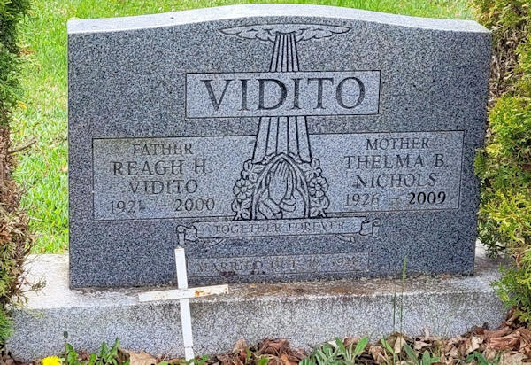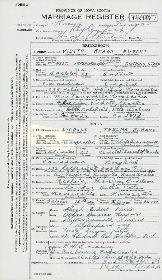 Parents Father: NICHOLS, Morley Puncheon Mother: PARKER, Hettie Eaton Birth Born on March 22, 1926 in Aylesford, Kings Co., NS Death Died on April 09, 2009 in Tatamagouche, Colchester Co., NS Buried in Aylesford Union Cemetery in Aylesford, Kings Co., NS Marriages VIDITO, Reagh Hubert Married on October 12, 1946 in Aylesford, Kings Co., NS Children VIDITO, Brian VIDITO, Gregory VIDITO, Elizabeth Notes Occupation: Stenographer/ Social Worker Obituary: VIDITO, Thelma Bernice - 83, Tatamagouche and formerly of Truro, passed away April 9, 2009, in Willow Lodge, Tatamagouche. Born in Aylesford, she was a daughter of the late Morley and Hettie (Parker) Nichols. She worked as a social worker in the Truro area for 20 years. She attended First United Church and was a member of the UCW. Thelma was a wonderful mother, friend and she was a leader in all she did. She is survived by daughter, Elizabeth (Graham) Burrows, Truro; sons, Gregory, Lower Sackville; Brian, Prince Edward Island; seven grandchildren; five great-grandchildren; sisters, Phyllis Jeannette Herbert, Frances LaVaughan "Bunny" Small, both of Aylesford. She was predeceased by her husband, Reagh Vidito. Visitation will be held on Saturday from 6-9 p.m. in Colchester Community Funeral Home, 512 Willow St., Truro, with a graveside service on Sunday at 3 p.m. in Aylesford Union Cemetery. Family flowers only. Donations in her memory may be made to the Willow Lodge, Tatamagouche or Heart and Stroke Foundation of Nova Scotia. On-line condolences may be made at: www.colchestercommunity.com Sources Funeral Home: Colchester Community Funeral Home Truro,NS Obituary April 2009 Images Reagh & Thelma (Nichols) Vidito Thelma Nichols Marriage Thelma Nichols