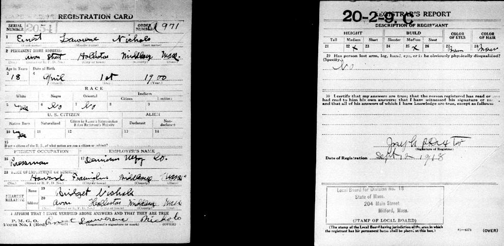 Parents Father: NICHOLS, Arthur Bernard Mother: HAVERTY, Bridget M. Birth Born on April 01, 1900 in Holliston, Middlesex Co., MA Death Died on September 19, 1974 in Natick, Middlesex Co., MA Buried in Saint Marys Cemetery in Holliston, Middlesex Co., MA Marriages NEWTON, Gladys Mae Married on July 24, 1920 in Holliston, Middlesex Co., MA Children NICHOLS, Madeline Rita: February 10, 1921 - July 04, 1979 NICHOLS, Ernest Lawrence: July 08, 1930 - May 27, 2019 NICHOLS, Arthur Bernard: February 11, 1934 - August 29, 1994 NICHOLS, Patricia A.: December 07, 1937 - January 25, 2020 Notes Occupation: Pressman/ Printer/ Worker Box Factory/ Truck Driver Sources Massachusetts Deaths: #044185 Images Ernest Nichols Birth Arthur & Bridget (Haverty) & Ernest Nichols Ernest Nichols WW1 Draft Ernest Nichols Marriage