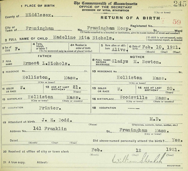 Parents Father: NICHOLS, Ernest Lawrence Mother: NEWTON, Gladys Mae Birth Born on February 10, 1921 in Framingham, Middlesex Co., MA Death Died on July 04, 1979 in Massachusetts, USA Buried in Saint Marys Cemetery in Holliston, Middlesex Co., MA Sources Massachusetts Cemeteries: Saint Marys Cemetery Holliston,MA Images Madeline Nichols Birth Madeline Nichols & Gladys (Newton) Nichols