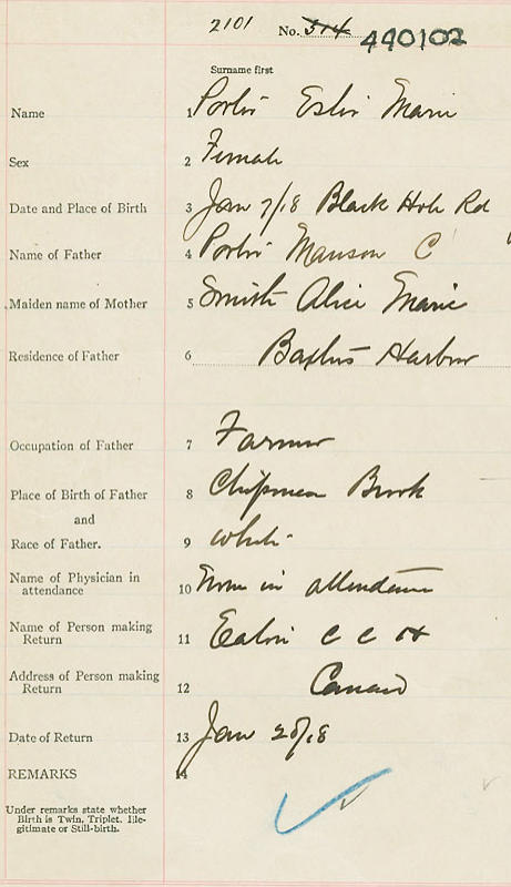 Birth Born on January 07, 1918 in Glenmount, Kings Co., NS Death Died on February 26, 2008 in Berwick, Kings Co., NS Buried in Berwick Cemetery in Berwick, Kings Co., NS Marriages SANFORD, Cecil Budd Married on October 30, 1937 in Berwick, Kings Co., NS Children SANFORD, Manson SANFORD, Emerson SANFORD, Donald SANFORD, Duane SANFORD, Ervin SANFORD, Barbara SANFORD, Olivia SANFORD, Carole SANFORD, Verna SANFORD, Beverly Margaret: 1938 - November 10, 2005 SANFORD, Budd R.: 1951 - October 05, 2009 Notes Obituary: Esther Sanford 90, passed away peacefully surrounded by her loving family on Tuesday February 26, 2008, in Grand View Manor, Berwick, where she had resided for the past 17 months. Born in Glenmont, Kings Co., on January 7, 1918, she was a daughter of the late Manson Caleb and Alice Marie Porter. She was, first and foremost, a wife, mother, grandmother and homemaker. She loved to cook for her family and was an avid gardener. Prior to losing her hearing, Esther loved to hear the voices of her two eldest children and to listen to music. Despite the fact that she was deaf, she raised 11 children and never looked at her loss of hearing as a disability. Her family hopes she can hear their voices, especially the children and that she can once again listen to music. She was respected and adored by her large family and will be sadly missed. She is survived by her sons, Manson (Alice), Moncton, N.B.; Emerson (Cheryl), Canmore, Alberta; Donald (Marie), Somerset; Budd (Nancy), North Alton; Duane (Chris), Elgin, N.B.; Ervin (Karen) Black Rock; daughters, Barbara (Boyd) Meisner, Black Rock; Olivia (Jack) Young, Aylesford; Carole (David) Rinzler, Riverview, N.B.; Verna (Richard) Ward, Coldbrook; 36 grandchildren; 29 great grandchildren; four great-great grandchildren; brother, Leander (Glenne) Centreville; sisters, Freda (Harold) Grover, Lakeville; Etta Dempsey, Fundy Villa, Berwick, and many nieces and nephews. Besides her parents, Esther was predeceased by her husband, Cecil Sanford; daughter, Beverly Foster; granddaughter, Kendra Faye Rinzler and three grand sons in infancy. Visitation for Mrs. Sanford will be held 7-9 p.m. Saturday March 1, in the H.C. Lindsay Funeral Home, 192 Commercial St., Berwick, N.S. B0P 1E0, (902-538-9900), from where a funeral service will be held at 3:30 p.m. Sunday March 2, with Rev. Elizabeth Johnson officiating. Burial will take place in Aylesford Union Cemetery with a reception to follow in the Aylesford Fire Hall. Donations in memory may be made to Grand View Manor, Berwick, or to a charity of choice. Private condolences to the family may be sent by visiting: www.hclindsayfuneralhome.ca Sources Funeral Home: H.C. Lindsay Funeral Home Berwick,NS Obituary February 2008 Images Mary E. (Patriquin) Patriquin Death James I. Patriquin Marriage Esther Porter Birth Cecil Sanford Marriage