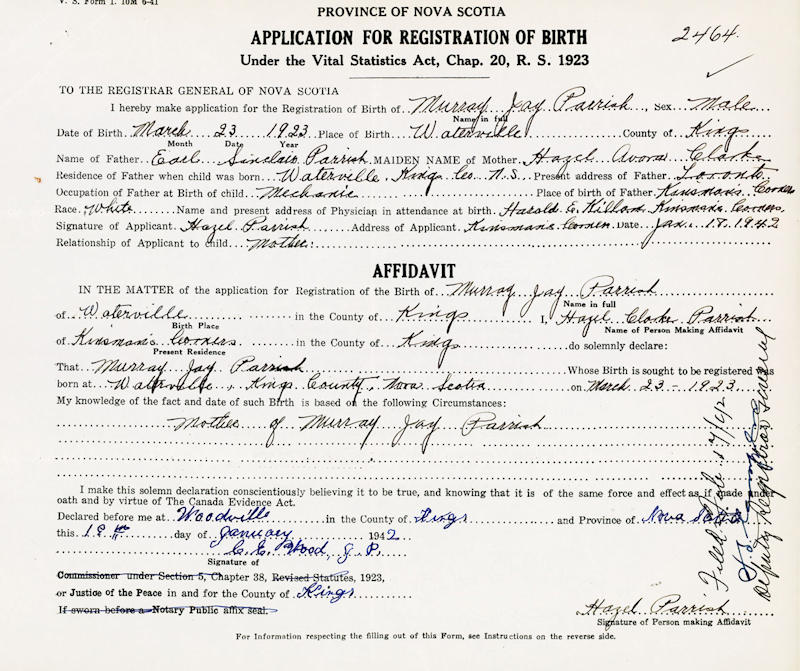 Birth Born on March 23, 1923 in Waterville, Kings Co., NS Death Died on 2003 in Kings Co., NS Buried in Lakeview Cemetery in Billtown, Kings Co., NS Marriages STRONG, Olive Ujeane Married on November 30, 1946 in Billtown, Kings Co., NS Children PARRISH, Terry PARRISH, Donna PARRISH, Marlene Notes Occupation: Farmer Sources Kings Cemetery Records: Lakeview Cemetery Billtown,NS Images Murray Parrish Birth Murray Parrish Olive Strong Marriage
