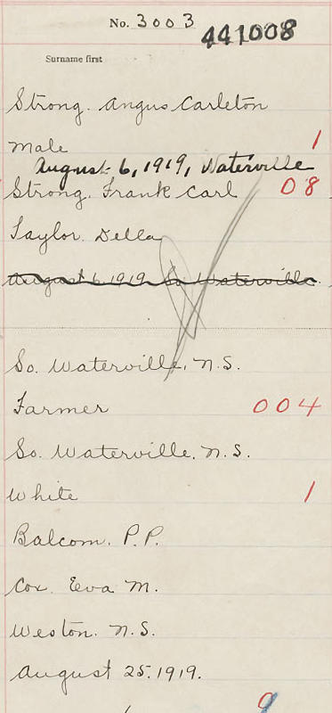 Parents Father: STRONG, Frank Carroll Mother: TAYLOR, Della Mary Birth Born on August 06, 1919 in Waterville, Kings Co., NS Death Died on July 11, 2009 in Kentville, Kings Co., NS Buried in Berwick Cemetery in Berwick, Kings Co., NS Marriages WALSH, Kathryn A. Married on October 20, 1950 Children STRONG, Carl STRONG, Brian STRONG, Richard STRONG, Tina STRONG, Donna STRONG, Dorothy STRONG, Nancy STRONG, Carol STRONG, Ronald Jack: November 05, 1952 - September 13, 2010 STRONG, Keith Edward: September 26, 1955 - April 16, 2018 Notes Obituary: Angus Strong 89, Kentville, formerly of Canning and Waterville Mountain passed away July 11, 2009, in Evergreen Home For Special Care. Born August 6, 1919, in Berwick, he was a son of the late Frank and Della (Taylor) Strong. Angus lived and worked in the Annapolis Valley all of his life. He was a hard worker and worked in farming, forestry and at Acadia University. Angus enjoyed Clydesdale horses. He is survived by sons, Ronald (Erlene), Medford; Brian (Linda), Canning; Richard (Wendy), Kentville; Keith, Wolfville; daughters Donna (Wayne) Balsor, Black Rock; Dorothy (David) Siscoe, Yarmouth; Nancy Blanchard, Yarmouth; Carol Strong, Kentville; brothers, Hartley and Laurice both of South Waterville; sisters: Edna (Douglas) Magee, Kentville; Esther Barteaux, Welland, Ont.; sister-in-law, Evelyn, South Waterville. Besides his parents, Angus was predeceased by wife, Katherine (Walsh); son Carl; daughter, Tina; sister, Pauline Lutz, and brothers, Orley and Harold. Visitation for the late Angus Carleton Strong will be from 2-4 and 7-9 p.m. Tuesday, July 14 in H.C. Lindsay Funeral Home, Berwick. A funeral service will be 2 p.m. Wednesday July 15 in Berwick Baptist Church, Rev. Marilyn Rose officiating. Private family interment will take place in Berwick Cemetery. Family flowers only please. Donations in memory may be made to the Heart and Stroke Foundation of Nova Scotia or to the Victorian Order of Nurses. Donations or cards and letters of sympathy may be sent to , 192 Commercial Street, Berwick Nova Scotia B0P 1E0 (902-538-9900) or on-line at:www.hclindsayfuneralhome.ca Occupation: Farmming/ Forestry Worker Sources Funeral Home: H.C. Lindsay Funeral Home Berwick,NS Obituary July 2009 Images Angus Strong Birth Angus & Katherine (Walsh) Strong