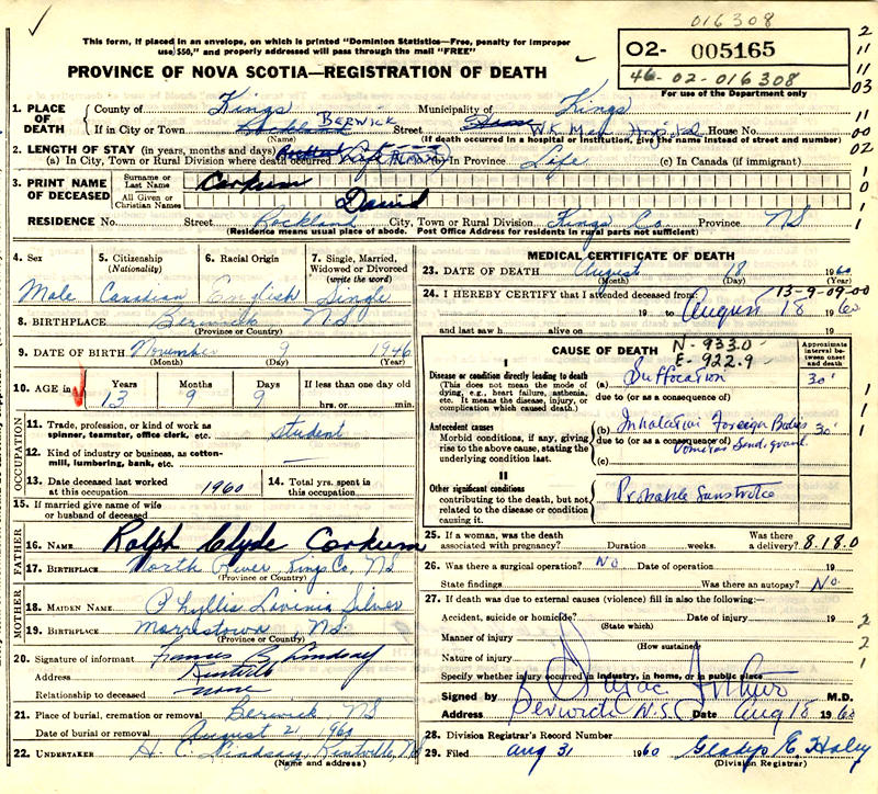 Parents Father: CORKUM, Ralph Clyde Mother: SILVER, Phyllis Lavinia Birth Born on November 09, 1946 in Berwick, Kings Co., NS Death Died on August 18, 1960 in Berwick, Kings Co., NS Buried in Berwick Cemetery in Berwick, Kings Co., NS Notes Death: Suffocation Inhalation of Foreign Bodies Sources Nova Scotia Deaths: Year 1960 #5165 Images Ralph & Phyllis (Silver) & David Corkum David Corkum Death