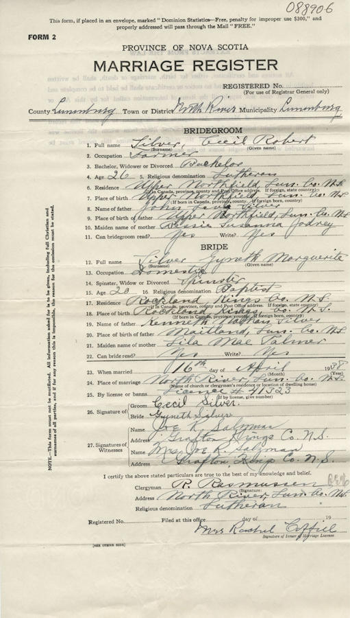 Birth Born on November 03, 1911 in Lower Northfield, Lunenburg Co., NS Death Died on December 02, 2002 in Berwick, Kings Co., NS Buried in Berwick Cemetery in Berwick, Kings Co., NS Marriages SILVER, Gyneth Marguerite Married on April 16, 1938 in North River, Lunenburg Co., NS Children SILVER, Keith SILVER, Sherald Margaret: November 02, 1942 - September 04, 2008 Notes Occupation: Farmer Sources Findagrave.com: https://www.findagrave.com/memorial/282485429/cecil_robert-silver Images Cecil Silver Birth Gyneth Silver Marriage