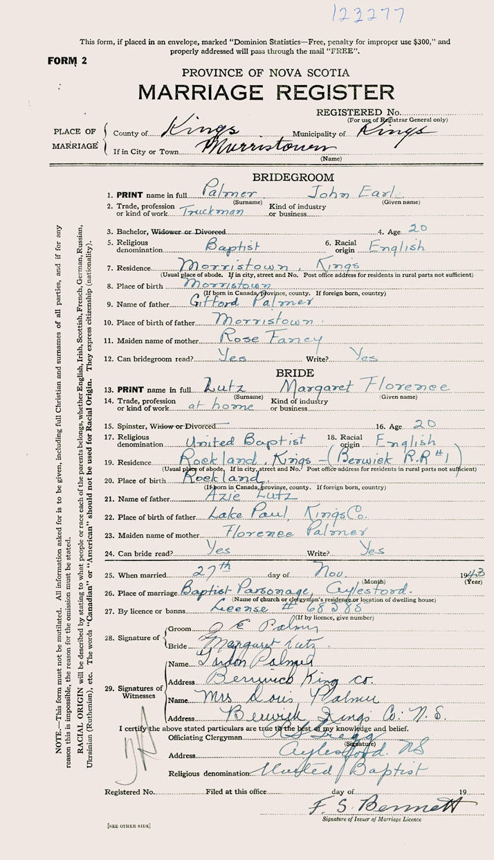 Parents Father: PALMER, Gifford Lorne Mother: FANCY, Rose Adelia Birth Born on August 31, 1923 in Morristown, Kings Co., NS Death Died on June 08, 2019 in Kings Co., NS Buried in Morristown Cemetery in Morristown, Kings Co., NS Marriages LUTZ, Margaret Florence Married on November 27, 1943 in Aylesford, Kings Co., NS Children PALMER, Sandra PALMER, Donna PALMER, Shirley Notes Occupation: Truckman/ Lumberman/ Owner of Home Hardwares Stores Obituary: It is with heavy hearts that the family of John Earle Palmer announces his passing on June 8, 2019 at the age of 95. Born in Morristown on August 31, 1923, he was the son of the late Gifford L. and Rose A. (Fancy) Palmer. John met the love of his life, Margaret, in a Rockland Sunday School class, marrying her in November of 1943. In his early working years, John logged his own trees and operated a small outdoor sawmill, while Margaret looked after the books. In the 1950s, the young couple erected "The Shop" next door to their Morristown home, which would become John E. Palmer Building Supplies Ltd. Their three daughters became involved in the family business, which eventually included sons-in-law, grandchildren and even the great-grandchildren in varying capacities. John was incredibly proud that, from humble beginnings, his business became a family legacy- one that grew and changed over the years to become the "Palmer Group", a group of Home Hardware stores across Nova Scotia. Even at 95, he would regularly visit the family's local Home Hardware stores in Berwick, Wolfville, Kentville and Canning, chatting with customers and staff and hoping to happen upon a family member employed there. John proudly received the Golden Hammer award for 50 years in the Hardware Industry in 2009. He was a member of the Morristown Baptist Church and loved to play cards, especially 45s. He was an avid golfer, proud to have witnessed a hole-in-one but disappointed to have never shot one himself. He enjoyed travel and spent many winters with Margaret at their home in Carefree, Florida. Closer to home, he also loved spending time at his cottage in Lake Paul in the summer. He cherished his family and was especially proud of his grandchildren and great-grandchildren, always interested in their lives and available for golf tips. After nearly 60 years of marriage, he became a widower. He was fortunate to find companionship once again with Winifred Molyneaux, who became his second wife in 2005. John had a quick wit, enjoyed a good joke, and loved to tease. He had a zest for life and (more than) occasionally cheated at cards and golf. His life was rich with love and laughter. We may never know how the Ace of Hearts would land in his shirt pocket or how many mulligans he really had, but we do know that he will be profoundly missed. He is survived by his wife Winifred Palmer, Kentville; daughters Sandra (Garnet) Gould, Canaan; Donna (Raymond) Bishop, Port Williams; Shirley (Stuart) Hinson, Charlottetown; grandchildren Shelley (Mike) Young, Lower Sackville; Kimberley (Charles) Smolenaars, Kentville; Cal Gould, Edmonton; Jyl Bishop Veale (Brian Veale), Wolfville; Leanne Bishop (Michael Mason), Los Angeles; Andrew Bishop (Melissa), Port Williams; Sabrina Hinson, Charlottetown; great-grandchildren, Benjamin, Abigail, Grace and Lucy Smolenaars, Anastasia and Kieran Gould, Olivia and Rachel Veale, and Elliott, Lila and Emmett Bishop. John was the last surviving member of his immediate family. Besides his parents and first wife, he was predeceased by his brothers Lewis, Mark, and Gordon and his sister Marguerite Keddy. A Celebration of Life will be held on Monday, June 17, 2019 at 11:00 am in the Morristown Baptist Church with Rev. Chad Clements officiating. A reception will be held in the Morristown Community Centre following the service. Family only interment will be in the Morristown Cemetery. Family Flowers only. The Service can be viewed live on John's Memorial Page below the obituary. In lieu of flowers, memorial donations may be made to the Morristown Baptist Church. Arrangements have been entrusted to Serenity Funeral Home, Berwick Funeral Chapel, 192 Commercial Street, Berwick, NS, B0P 1E0 (902-538-9900). Sources Funeral Home: Serenity Funeral Home Berwick,NS Obituary June 2019 Images John E. Palmer Birth John E. & Margaret (Lutz) Palmer Margaret Lutz Marriage John E. Palmer