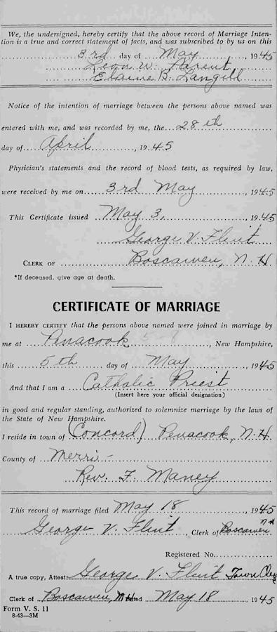 Birth Born on April 24, 1912 in Tilton, Belknap Co., NH Death Died on 1975 in Laconia, Belknap Co., NH Buried in Sacred Heart Cemetery in Laconia, Belknap Co., NH Marriages LANGILL, Elaine Bessette Married on May 05, 1945 in Penacook, Merrimack Co., NH Children PARENT, Leon William: December 17, 1946 Notes Occupation: Ski Maker Images Leon Parent Leon Parent WW2 Draft Elaine Langill MarriageA Elaine Langill Marriage