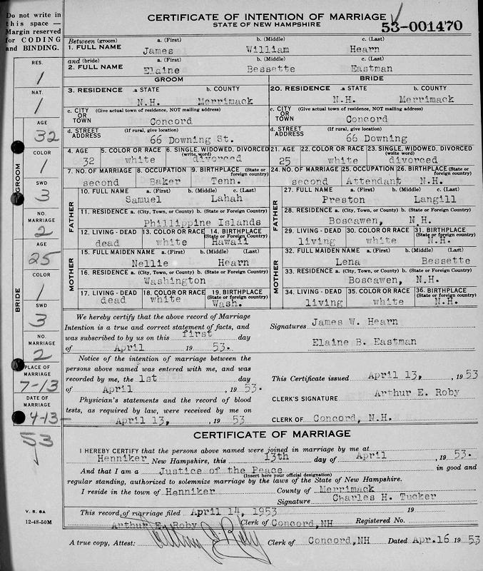 Birth Born on October 10, 1912 in Tennessee, USA Death Died on April 22, 1988 in Attleboro, Bristol Co., MA Buried in Blossom Hill Cemetery in Concord, Merrimack Co., NH Marriages LANGILL, Elaine Bessette Married on April 13, 1953 in Concord, Merrimack Co., NH Children HEARN, Paula Elaine: August 23, 1953 HEARN, Joseph L.: November 29, 1954 HEARN, Wanda B.: October 26, 1956 Notes Occupation: Baker Sources Massachusetts Deaths: #026355 Images James Hearn Elaine (Langill) Eastman Marriage3