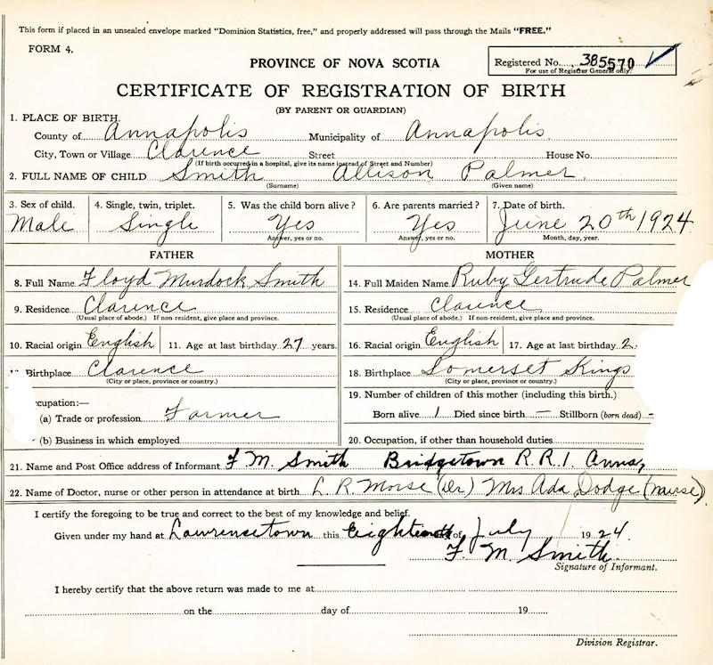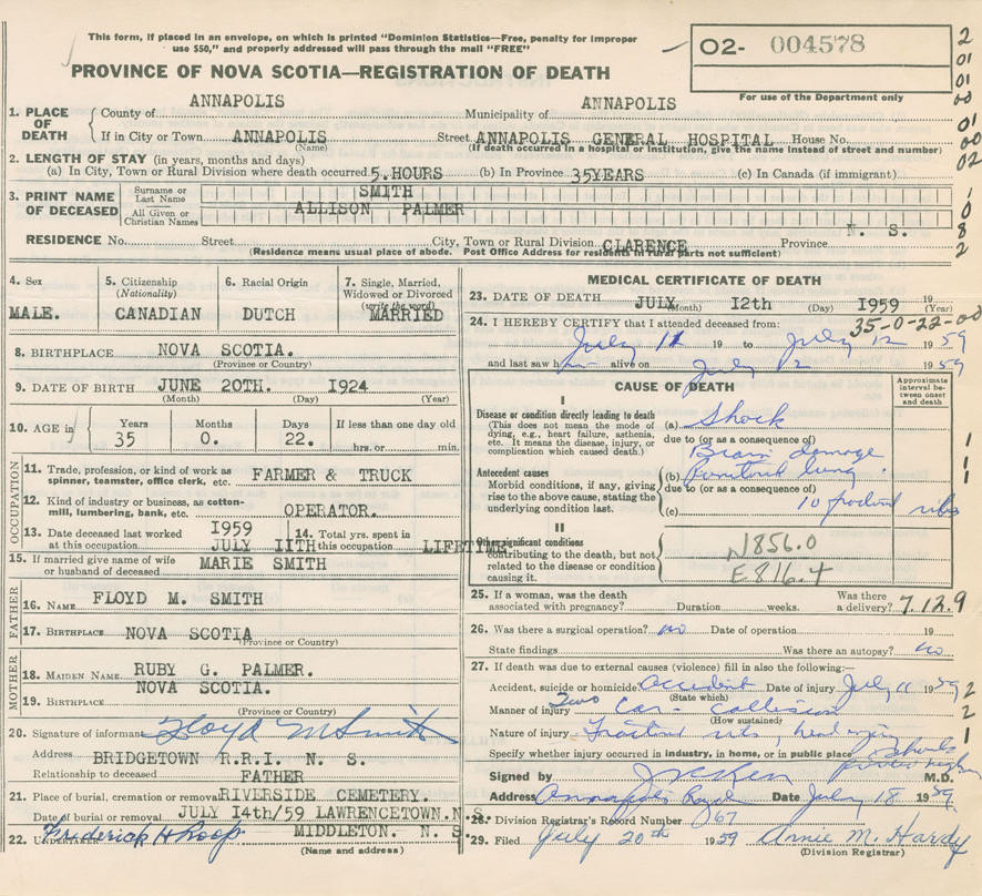 Parents Father: SMITH, Floyd Murdock Mother: PALMER, Ruby Gertrude Birth Born on June 20, 1924 in Clarence, Annapolis Co., NS Death Died on July 12, 1959 in Annapolis Royal, Annapolis Co., NS Buried in Fairview Cemetery in Lawrencetown, Annapolis Co., NS Marriages GILLIS, Marie Vivian Married on December 03, 1948 in Clarence, Annapolis Co., NS Children SMITH, Donald Notes Occupation: Farmer - Truck Driver Death: Automobile Accident Brain Damage/ Fractured Ribs - Punctured Lung Sources Nova Scotia Deaths: Year 1959 #4578 Images Allison Smith Birth Allison Smith Floyd & Ruby (Palmer) Smith & Allison & Marie (Gillis) Smith Allison Smith Death Allison Smith Marriage