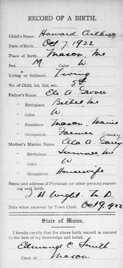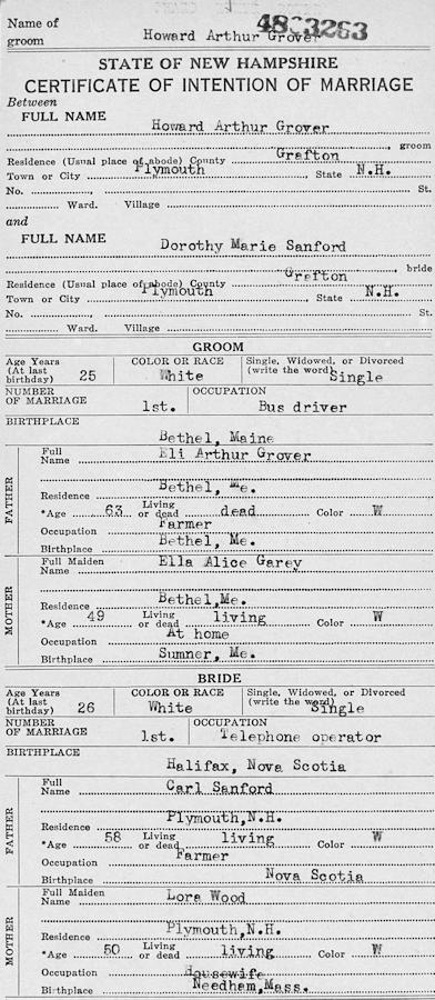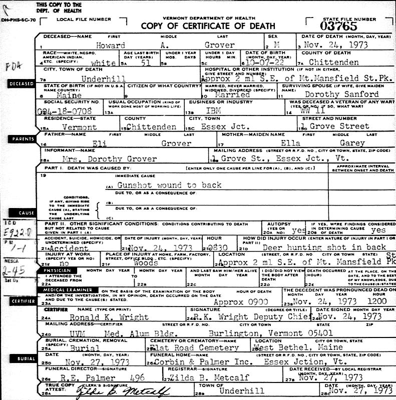 Birth Born on October 07, 1922 in Mason, Oxford Co., ME Death Died on November 24, 1973 in Underhill, Chittenden Co., VT Buried in Flat Cemetery in West Bethel, Oxford Co., ME Marriages SANFORD, Dorothy Marie Married on February 21, 1948 in Plymouth, Grafton Co., NH Children GROVER, Roberta Jean: November 12, 1948 Notes Occupation: Bus Driver/ Employee at IBM Military Service: WW2 US Army Death: Hunting Accident Shot in the back Sources Vermont Deaths: #3765 Images Howard Grover Birth Howard & Dorothy (Sanford) Grover Howard Grover Death Dorothy Sanford Marriage1 Dorothy Sanford Marriage