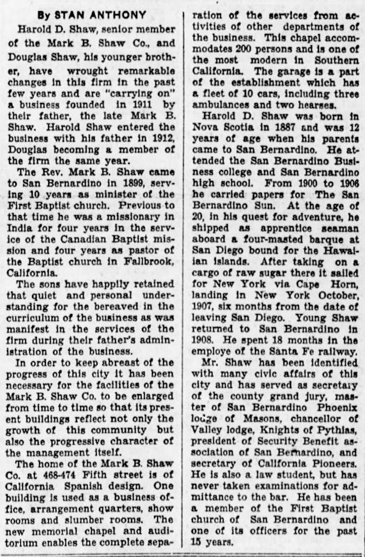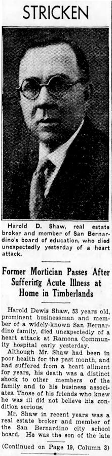 Parents Father: SHAW, Mark Bailey Mother: DEWIS, Antoinette Birth Born on May 03, 1887 in Port Morian, Cape Breton Co., NS Death Died on February 04, 1941 in San Bernardino, San Bernardino Co., CA Buried in Mountain View Cemetery in San Bernardino, San Bernardino Co., CA Marriages JOHNSTON, Mabel Irene Children SHAW, Dewis Milton: December 03, 1917 - March 29, 1989 SHAW, Muriel M.: December 12, 1919 SHAW, Martha Mabel: August 06, 1925 SHAW, Patricia Ruth: January 01, 1930 - November 15, 1948 Notes Occupation: Mortician/ Real Estate Broker Death: Heart Attack Images Harold Shaw Harold Shaw WW1 Draft Harold Shaw History Harold Shaw Obit