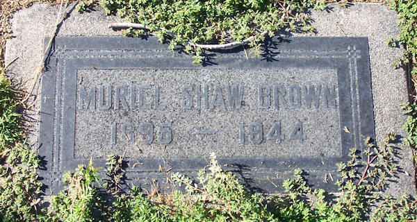 Parents Father: SHAW, Mark Bailey Mother: DEWIS, Antoinette Birth Born on September 20, 1895 in Ontario, San Bernardino Co., CA Death Died on February 29, 1944 in San Bernardino, San Bernardino Co., CA Buried in Mountain View Cemetery in San Bernardino, San Bernardino Co., CA Marriages BROWN, Donald Watson Children BROWN, Donald Shaw: December 06, 1915 - May 20, 2004 Notes Death: Suicide Gun Shot Obituary: DESPONDENT WOMAN TAKES HER OWN LIFE Apparently despondent over ill health, Muriel Joy Shaw Brown, 48, wife of Donald Watson Brown, and member of a widely known San Bernardino family, shot and fatally wounded herself at her home, 1032 Arrowhead Avenue, at 3 a.m. yesterday, according to Coroner R. E. Williams. Mrs. Brown died at the county hospital at 4:25 a.m. She was the daughter of the late Mark B. Shaw, Baptist minister and founder of Mark B. Shaw Co. and the late Antoinette Shaw. Mr. Brown, employee of the Pacific Electric Co., said Mrs. Brown underwent an operation last October and had been in ill health since. He said she had also been grieving over two recent deaths in the family. In addition to her husband, Mrs. Brown is survived by one son, Donald Shaw Brown, employed by an electric company in Los Angeles; two brothers, Douglas M. Shaw of San Bernardino and W. Bartlett of Buena Park, and one sister, Mrs. Emily Hayward of San Bernardino. She was a native of Ontario and came to San Bernardino when she was 1 year old. Funeral services will be held Thursday at 11 a.m. at the Mark B. Shaw Memorial Chapel with interment in Mountain View Cemetery. The L. M. Knopsnyder & Son Mortuary of Colton in in charge of arrangements. Images Muriel Shaw Birth Muriel (Shaw) Brown