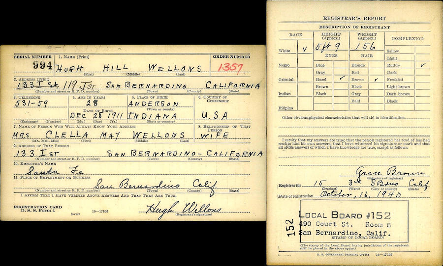 Birth Born on December 28, 1911 in Anderson, Madison Co., IN Death Died on September 09, 1990 in San Bernardino, San Bernardino Co., CA Buried in Mountain View Cemetery in San Bernardino, San Bernardino Co., CA Marriages SHAW, Clella Mae Children WELLONS, Hugh Thomas: October 28, 1941 WELLONS, Douglas Shaw: July 12, 1945 Notes Occupation: Musician Images Hugh Wellons Hugh Wellons WW2 Draft