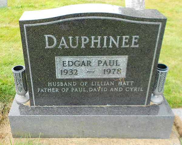 Birth Born on August 15, 1932 Death Died on October 23, 1978 in Dartmouth, Halifax Co., NS Buried in Woodlawn Cemetery in Dartmouth, Halifax Co., NS Marriages HATT, Lillian Louise Children DAUPHINEE, Paul DAUPHINEE, David DAUPHINEE, Cyril Sources Findagrave.com: https://www.findagrave.com/memorial/180554208/edgar-paul-dauphinee Images Edgar Dauphinee