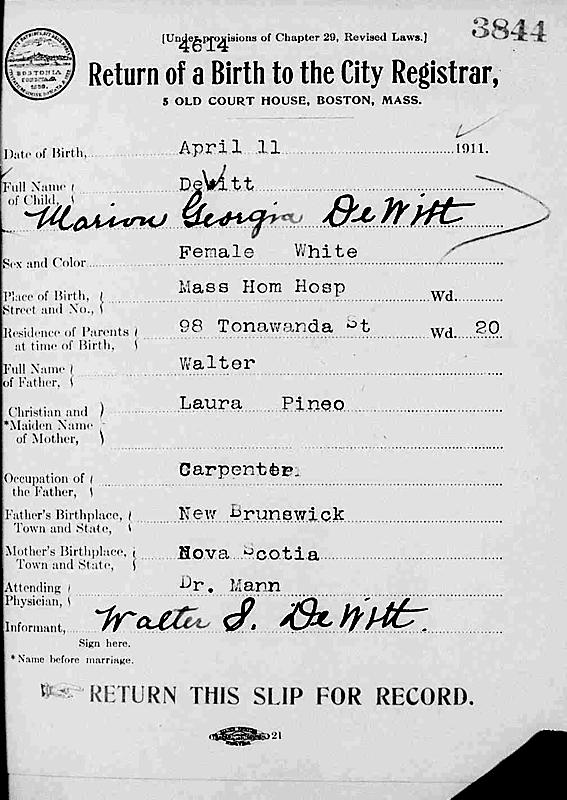 Parents Father: DEWITT, Walter Sydney Mother: PINEO, Laura DeWolfe Birth Born on April 11, 1911 in Boston, Suffolk Co., MA Death Died on March 07, 1981 in Barnstable, Barnstable Co., MA Buried in Milton Cemetery in Milton, Norfolk Co., MA Marriages O'CONNOR, Felix Arthur Married on 1934 in Massachusetts, USA Children O'CONNOR, Sydney Dewitt: March 29, 1935 - June 06, 2003 Sources Massachusetts Births: #022624 Images Marion Dewitt Birth Walter & Laura (Pineo) Dewitt & Felix & Marion (Dewitt) O''''''''Connor,Margaret & Walter L. Dewitt
