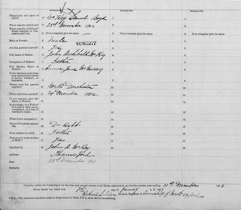 Birth Born on November 23, 1908 in Oxford North, Oxford Co., ON Death Died on April 03, 1983 in Vulcan, Vulcan Co., AB Buried in Vulcan Cemetery in Vulcan, Vulcan Co., AB Marriages CRAIG, Helen Claire Married on 1943 in Banff, Banff Co., AB Sources Findagrave.com: https://www.findagrave.com/memorial/114623097/samuel_boyd-mckay Images Samuel McKay Birth Samuel McKay Helen Craig Wedding The Calgary Albertan Calgary,AB Nov 24,1943