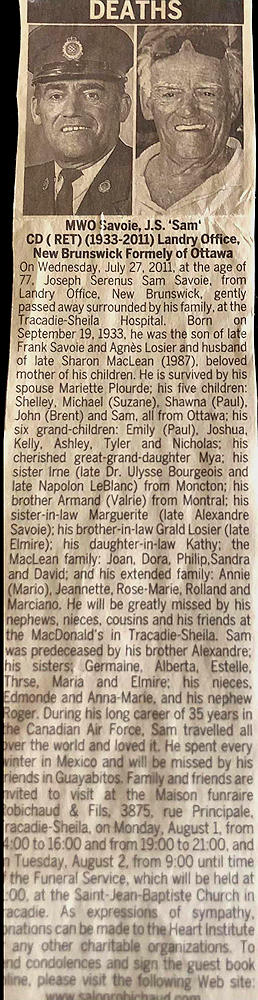Birth Born on September 19, 1933 in Tracadie, Gloucester Co., NB Death Died on July 27, 2011 in Tracadie, Gloucester Co., NB Marriages MACLEAN, Sharon Lynn Married on January 29, 1955 in Truro, Colchester Co., NS Children SAVOIE, Shelly Lynne: March 26, 1956 SAVOIE, Joseph Robert Michael: November 12, 1957 SAVOIE, Shawna Lee: July 03, 1959 SAVOIE, John Francis: May 30, 1961 SAVOIE, Samuel Colin: July 22, 1975 Notes Occupation: RCAF Master Warrant Officer Sources Funeral Home: Maison Funraire Robichaud & Fils Tracadie,NB Obituary July 2011 Images Joseph Savoie Obit