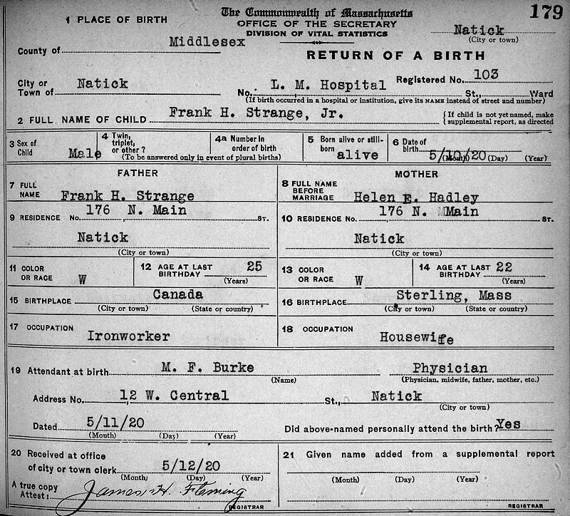 Birth Born on May 10, 1920 in Natick, Middlesex Co., MA Death Died on September 21, 2013 in Mount Pleasant, Charleston Co., SC Buried in Dell Park Cemetery in Natick, Middlesex Co., MA Marriages CHURCH, Barbara Louise Married on 1943 Children STRANGE, Frank Hiatt: November 08, 1946 STRANGE, Susan L.: March 05, 1950 Notes Military Service: WW2 US Army Occupation: Carpenter/ Building Inspector Obituary: Frank H. Strange, Jr., of Mount Pleasant, SC and Sherborn, MA, passed away peacefully on the morning of September 21, 2013. He was 93. Frank was the son of the late Frank H. Strange, Sr. and Helen (Hadley) Strange of Natick, MA. He grew up in Natick, and after completion of High School he was proud to serve his country in the Army during WWII. Like many young men of his generation he altered the year of his birth in order to join the National Guard early. He received recognition for his service and skills during the war, but he was humble about those outstanding acts and did not talk too much about them. After serving in WWII he returned home and married his beloved wife of 46 years, Barbara (Church). Barbara preceded Frank in death in March of 1990. Frank received a diploma in engineering from ITT Technical Institute and, like his father before him, made his career as a self-employed carpenter for over 50 years. Many homes in the neighborhoods of Natick, Sherborn, Dover, Holliston, Medway, and Millis bear his craftsmanship in some way. There was very little he could not make out of wood. If he needed a tool to complete a task, he rarely bought it. Instead, he made it. He crafted working guitars and violins as well as many keepsake items. Frank built his final home at roughly the age of 60. That home was in Millis, MA. If you ever travel down Bullard Lane, you will see the stone wall he built by hand using materials that came from his own land. At the age of 80 he re-roofed that home by himself. When asked by family and locals if they could help he declined and explained when he designed the home he built the roof with just the right pitch that he would be able to replace it on his own. In addition to woodworking Frank was also a very talented painter. His paintings capture some of his favorite New England places from Massachusetts historical sites to the Lakes of New Hampshire and the Sea Coast of Maine. In addition to these accomplishments, he was a professional stamp collector, Cub Master of the Cub Scouts in Sherborn, Building Inspector for the Town of Sherborn, treasured member of the Fiske Memorial Methodist Church in Natick, and later of the Congregational Church of Millis. If you met Frank you learned very early on that he was a man of physical strength (be careful when you shake his hand it's a bone crusher), loyalty, and pride of his craft, his character, and his family. He enjoyed sharing stories of his youth and traveling back and forth between family farms in both the US and Canada. He would talk to you about history, he would talk to you about the people he knew, he would talk to you about anything. No pun intended but he never met a stranger. He was a man of great imagination with the biggest smile and a sparkle in his eye. As much as all he adored about his life, he was also a dog lover... and they loved him. Frank and Barbara raised their family in Sherborn, MA, and are survived by their two children, Frank H. Strange, III of Charleston, SC and wife Bernadette, and Susan (Strange) Otenti Gould and husband Dennis of Gorham, ME. Frank was always quick to brag about his combined 14 grand and great-grandchildren, Diana (Strange) Wood, Jennifer Strange, Frank H. Strange, IV, Kerry (Strange) Corbett, Tara (Otenti) Makara, Scott Otenti, Corissa Strange, Nicholas Otenti, Leandra Strange, Sean Makara, Alliyah Strange, Liam Strange, Sophia Strange, and Christian Corbett. Frank is also survived by his sister, Joyce Leighton of Baldwinville, MA; and was preceded in death by his brothers Hilton Strange, Landon Strange, of Natick, MA, F. Rae Strange of Arlington, TX, and Robert Strange of Virginia, as well as his sister Phyllis (Strange) Stackpole of Natick, MA. Frank will be missed, but his life will be celebrated. As he would say, "Buy land, there is only so much of it, and when it's gone you can't make any more;" and "It's always good to have some WAM in your pocket." A Funeral Service will be held, September 24, 2013, in the J. Henry Stuhr, Inc., Mount Pleasant Chapel, at 11:00 am. The family will receive friends one hour prior to the service. Interment services will be held later in Dell Park Cemetery, Natick, MA. Sources Funeral Home: J. Henry Stuhr, Inc. Mount Pleasant,SC Obituary September 2013 Images Frank Strange Birth Frank & Barbara (Church) Strange Frank Strange Jr
