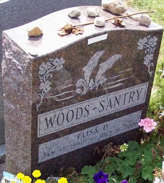 Parents Father: SANTRY, William Anthony Mother: WOODS, Elisa Deloris Birth Born on January 12, 1990 in Dorchester, Suffolk Co., MA Death Died on July 16, 2006 in San Juan Co., UT Buried in Cedar Grove Cemetery in Dorchester, Suffolk Co., MA Notes Obituary: Elisa Santry of South Boston, July 16, 2006. Cherished daughter of Elisa Woods and William Santry. Beloved sister of Michael Woods of California, Stephen Woods and Jonathan Woods both of Dorchester. Cherished aunt of Kevin, Jenna & Ka-Leigh Woods. Also survived by many loving aunts, uncles, cousins and friends. Funeral from The O'Brien Funeral Home, 146 Dorchester Street, SOUTH BOSTON, Monday at 9:00 AM. Funeral Mass in Gate of Heaven Church at 10:00 AM. Relatives and friends invited. Visiting hours Sunday 3-8 PM. Interment Cedar Grove Cemetery, Dorchester MA. Boston Globe Boston,MA July 22,2006 Sources Findagrave.com: https://www.findagrave.com/memorial/15028557/elisa_delia_woods-santry Images Elisa Woods-Santry Elisa Santry