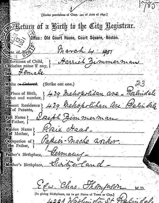 Birth Born on March 04, 1901 in Roslindale, Suffolk Co., MA Death Died on May 23, 1998 in Boston, Suffolk Co., MA Buried in Puritan Lawn Memorial Park in Peabody, Essex Co., MA Marriages FORD, Sumner Maxwell Notes Occupation: Stitcher Shoe Factory Sources Massachusetts Deaths: #003325 Images Harriet Zimmerman Birth Sumner & Harriet (Zimmerman) Ford