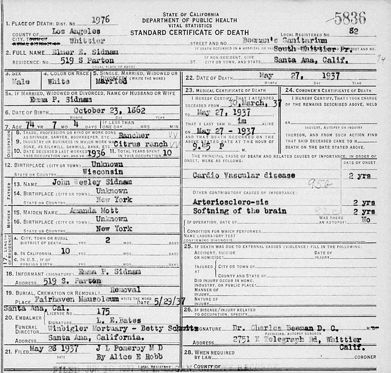 Birth Born on October 23, 1862 in Wisconsin, USA Death Died on May 27, 1937 in Whittier, Los Angeles Co., CA Buried in Lakewood Cemetery in Minneapolis, Hennepin Co., MN Marriages PURVES, Emma R. Notes Occupation: Real Estate/ Citrus Rancher Death: Cardio Vascular Disease Sources California Deaths: Los Angeles Co. #5836 Images Elmer Sidham Elmer Sidnam Death