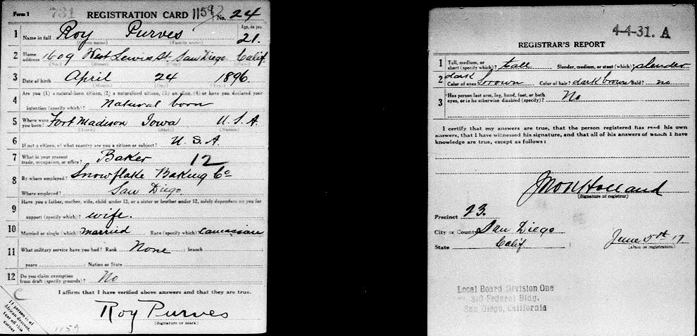 Parents Father: PURVES, Fred Renton Mother: YOUNG, Daisy A. Birth Born on April 24, 1897 in Fort Madison, Lee Co., IA Death Died on August 17, 1979 in Los Angeles Co., CA Buried in Valhalla Memorial Park in North Hollywood, Los Angeles Co., CA Marriages ANDERSON, Martha Elizabeth Children PURVES, Robert Renton: October 19, 1923 - September 07, 2013 Notes Occupation: Manager Flour Mill/ Baker Snowflake Baking Co./ Baker Log Cabin Bread Co. Images Roy Purves WW1 Draft Roy Purves WW2 Draft