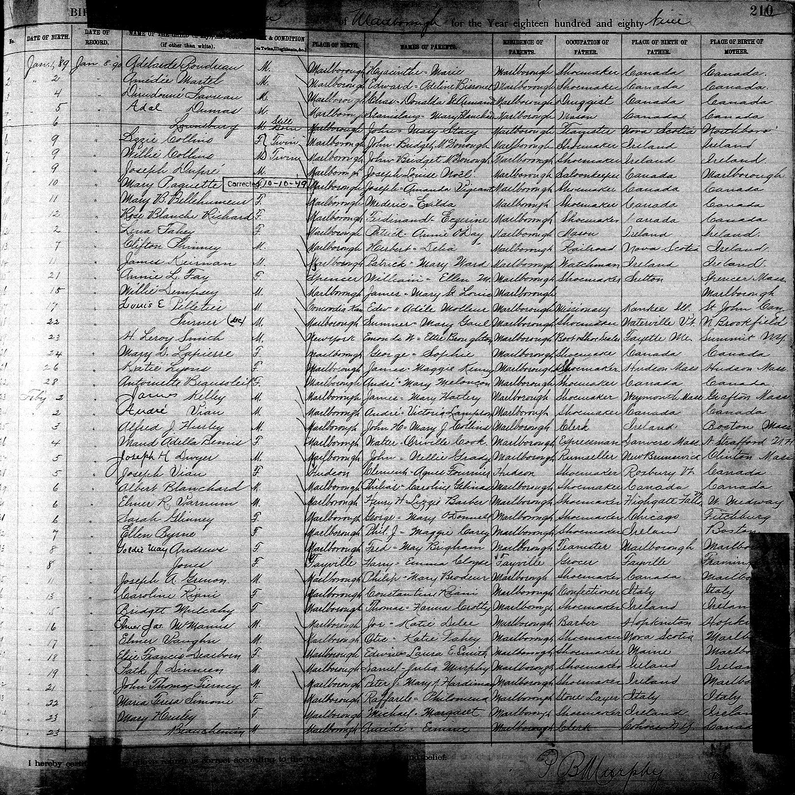 Parents Father: PHINNEY, Herbert Parkman Mother: DAVOCK, Adelia Birth Born on January 17, 1889 in Marlborough, Middlesex Co., MA Death Died on July 31, 1889 in Marlborough, Middlesex Co., MA Sources Massachusetts Deaths: Marlborough Pg. 177 #175 Images Clifton Phinney Birth Clifton Phinney Death