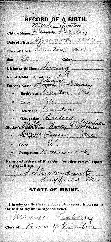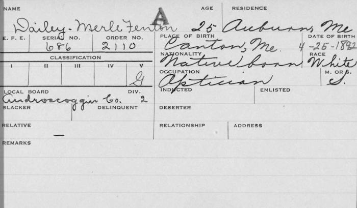 Birth Born on April 25, 1892 in Canton, Oxford Co., ME Death Died on 1969 in Waltham, Middlesex Co., MA Buried in Newton Cemetery in Newton, Middlesex Co., MA Marriages PATRICK, Muriel Greenwood Married on 1926 in Waltham, Middlesex Co., MA Notes Occupation: Optician/ Sales Manager Automobiles/ Commercial Traveller/ Engineering General Electric Co. Images Merle Dailey Birth Merle & Muriel (Patrick) Dailey Merle Dailey WW1 Draft