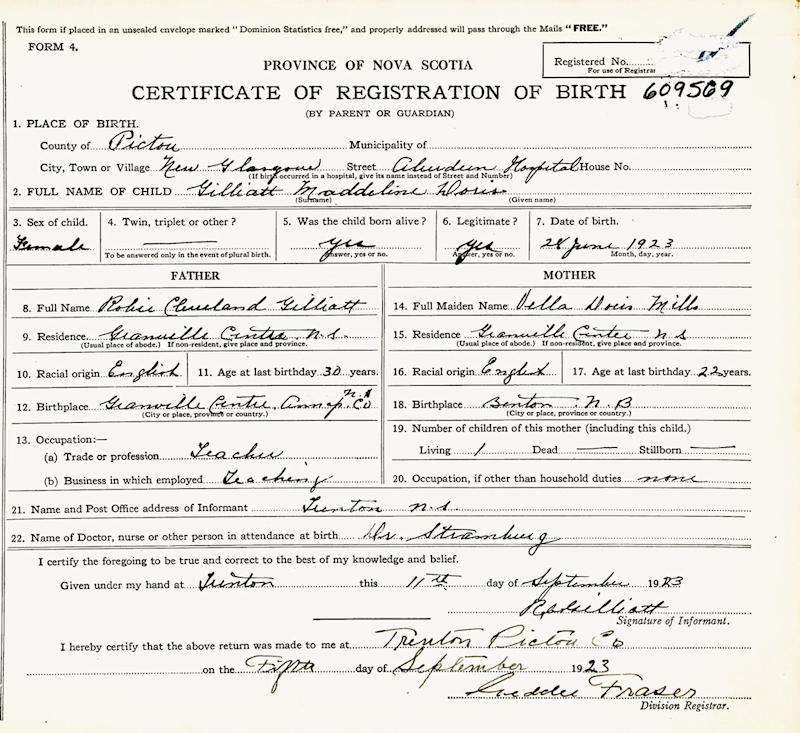 Parents Father: MILLS, Vella Doris Mother: GILLIATT, Robie Cleveland Birth Born on June 28, 1923 in New Glasgow, Pictou Co., NS Death Died on February 29, 1928 in Upper Clements, Annapolis Co., NS Buried in Wadeville Cemetery in Granville Centre, Annapolis Co., NS Notes Death: Spinal Meningitis Sources Nova Scotia Deaths: Year 1928 File 115 #248 Images Doris Gilliatt Birth Doris Gilliatt. Doris Gilliatt Death