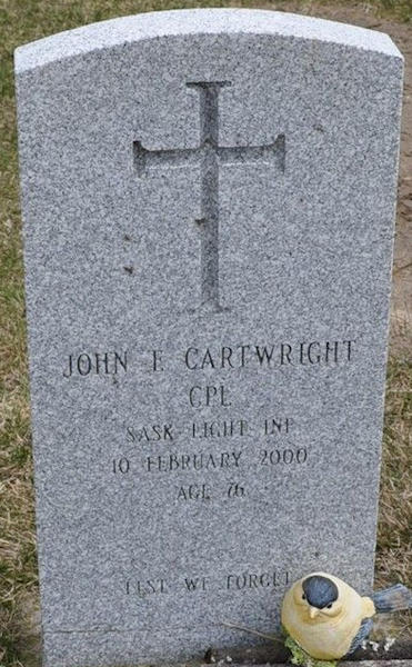 Birth Born on 1924 in St. Thomas, Elgin Co., ON Death Died on February 10, 2000 in St. Thomas, Elgin Co., ON Buried in South Park Cemetery in Lyndale, Elgin Co., ON Marriages GILLIATT, Hazel Marie Children CARTWRIGHT, Helen CARTWRIGHT, Richard CARTWRIGHT, Catherine CARTWRIGHT, Elizabeth: 1955 Notes Occupation: Royal Canadian Army Sources Cemetery: South Park Cemetery Lyndale,ON Images John Cartwright