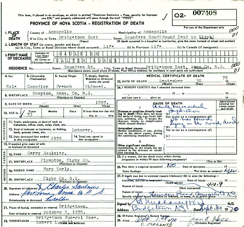 Birth Born on September 03, 1897 in Phinney's Cove, Annapolis Co., NS Death Died on September 30, 1970 in Bridgetown, Annapolis Co., NS Buried in Riverside Cemetery in Bridgetown, Annapolis Co., NS Marriages PHINNEY, Lerena E. Married on May 15, 1928 in Bridgetown, Annapolis Co., NS Notes Occupation: Farmer Death: Acute Myocardial Infarction Military Service: WW1 CEF Sources Nova Scotia Deaths: Year 1970 #7408 Images Walter Saulnier Birth Walter Saulnier Walter Saulnier Death Lerena Phinney Marriage