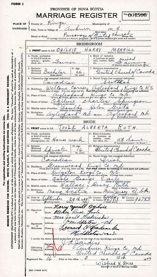Parents Father: OGILVIE, Charles Spurgeon Mother: BOWLBY, Helen Greta Birth Born on October 18, 1922 in Aylesford, Kings Co., NS Marriages TOOLE, Alberta Ruth Married on September 29, 1949 in Auburn, Kings Co., NS Children OGILVIE, Merrill OGILVIE, Jane OGILVIE, Timothy Charles: September 02, 1956 - February 20, 1957 OGILVIE, Dan Loring: December 04, 1957 - April 03, 1962 OGILVIE, Robert Roy Joseph: February 08, 1963 - November 28, 2014 Images Harry Ogilvie Birth Harry Ogilvie Marriage
