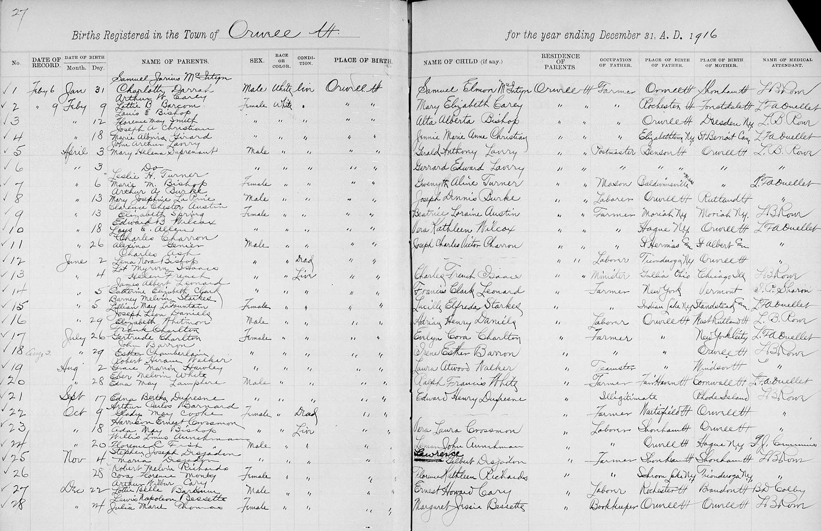 Birth Born on June 05, 1916 in Orwell, Addison Co., VT Death Died on July 28, 2004 in Berlin, Washington Co., VT Buried in Mount Hope Cemetery in Northfield, Washington Co., VT Marriages LYONS, Muriel Frances Married on March 03, 1943 in Andover, Windsor Co., VT Children LEONARD, Karen E.: February 13, 1944 LEONARD, Susan Ann: August 09, 1946 - March 22, 2014 LEONARD, Francis Clark: December 28, 1949 - January 30, 2021 Notes Military Service: WW2 USAAF Staff Sergeant Occupation: Credit Office Manager Sources Vermont Deaths: Vermont Death Records, 1909-2008 Images Francis Leonard Birth Francis & Muriel (Lyons) Leonard & Susan (Leonard) Gregg Francis Leonard Muriel Lyons Marriage