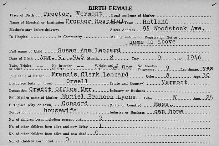 Parents Father: LEONARD, Francis Clark Mother: LYONS, Muriel Frances Birth Born on August 09, 1946 in Proctor, Rutland Co., VT Death Died on March 22, 2014 in Randolph, Orange Co., VT Buried in Calvary Cemetery in Northfield, Washington Co., VT Marriages GREGG, David Hamilton Married on 1971 in Northfield, Washington Co., VT Children GREGG, Justin David: 1975 Notes Obituary: RANDOLPH \emdash Susan Leonard Gregg, 67, died Saturday, March 22, 2014, at Menig Extended Care in Randolph. She was born Aug. 9, 1946, in Proctor, the daughter of Francis and Muriel (Lyons) Leonard. Susan attended Northfield schools and graduated from Northfield High School. She continued her education, earning an associate degree from Vermont College for Women in 1966. She was married to David Gregg in 1971 in Northfield. Susan worked as an administrative assistant for C.R. Swaney & Co. in Waltham, Mass., from 1971-1972. She then was an executive assistant at Keydata Corp. in Newton, Mass., from 1972-1974. She was the executive assistant for the Randolph Chamber of Commerce from 1982-1994, at which time she became the executive director until 1997. Most recently she was an administrative assistant at Dartmouth-Hitchcock Medical Center in Lebanon, N.H. She had also worked with the American Field Service. Her memberships included the Randolph Singers and the Montpelier Community Gospel Choir. Susan had been active with the Vermont Chamber of Commerce. In earlier years, she enjoyed swimming, skating and skiing. She also enjoyed traveling. She is survived by her son, Justin Gregg, and wife Ranke deVries and their daughter, Mila Gregg, of Helmond, Netherlands; a sister, Karen Cohen, and husband Robert, of Bolton, Mass.; a brother, Clark Leonard, and wife Kelly, of Northfield; many nieces and a nephew. She was predeceased by her parents and her former husband, David Gregg. Funeral services will be held Saturday, March 29, at 11 a.m. at Bethany United Church of Christ, Randolph, with the Rev. Robin Junker officiating. There are no calling hours. Burial will be at a later date in Calvary Cemetery, Northfield. Memorial contributions may be made to Menig Extended Care, P.O. Box 2000, Randolph, VT 05060; the ALS Association, 1275 K St., NW, Suite 250, Washington, D.C. 20005; or the Central Vermont Humane Society, P.O. Box 687, Montpelier, VT 05601. Online condolences may be left at www.dayfunerals.com. Arrangements are under the direction of the Day Funeral Home, Randolph. Occupation: Administrative Assistant C.R. Swaney & Co./ Executive Assistant Keydata Corp./ Executive Assistant - Executive Director Randolph Chamber of Commerce Sources Newspaper Obituary: The Barre Montpelier Times Argus Barre,VT March 26,2014 Images Susan Leonard Birth Francis & Muriel (Lyons) Leonard & Susan (Leonard) Gregg Susan Leonard