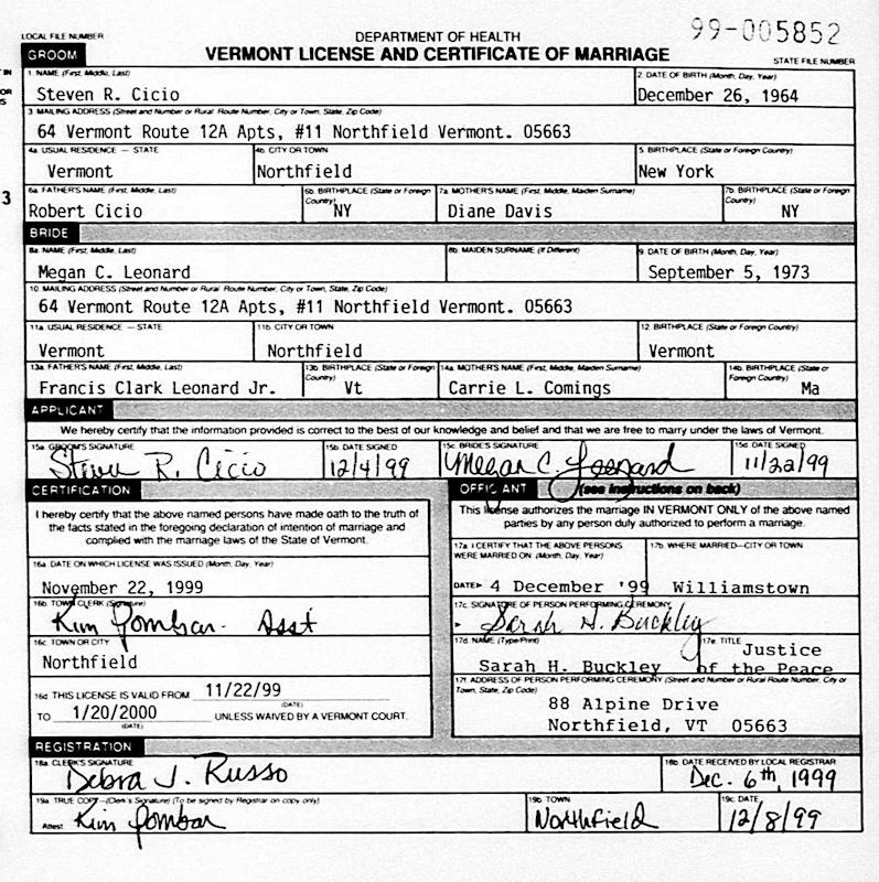 Birth Born on December 26, 1964 in New York, USA Marriages LEONARD, Megan Catherine Married on December 04, 1999 in Williamstown, Orange Co., VT Children CICIO, Gabrielle Elise: May 28, 1999 Images Megan Leonard Marriage