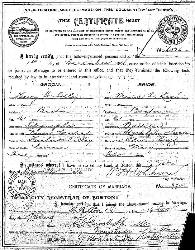 Birth Born on 1876 in Stockholm, Sweden Marriages TILLEY, Harry Clifford Married on February 16, 1897 in Boston, Suffolk Co., MA Children TILLEY, Girl: August 01, 1897 Notes Occupation: Waitress/ Domestic Images Harry Tilley Marriage