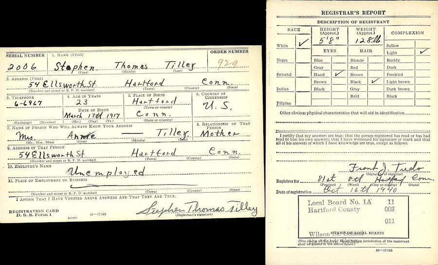 Parents Father: TILLEY, Winslow Lock Mother: McDONALD, Annie Birth Born on March 17, 1917 in Hartford, Hartford Co., CT Images Stephen Tilley WW2 Draft