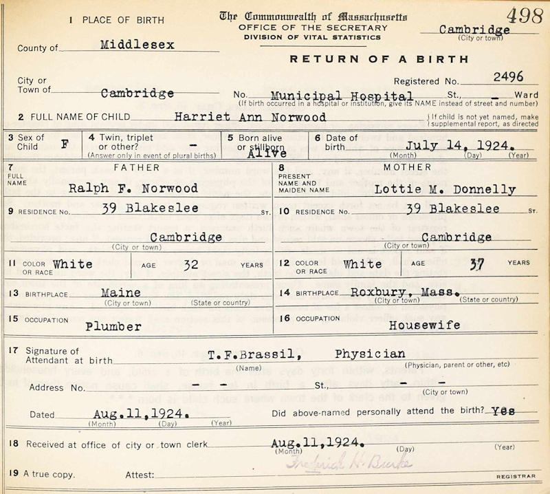 Birth Born on July 14, 1924 in Cambridge, Middlesex Co., MA Death Died on September 06, 2003 in Chatham, Barnstable Co., MA Buried in Seaside Cemetery in Chatham, Barnstable Co., MA Marriages CLARK, Donald Edmund Children CLARK, Donna A.: 1947 CLARK, Nancy J.: January 08, 1950 - April 14, 2011 Images Harriett Norwood Birth