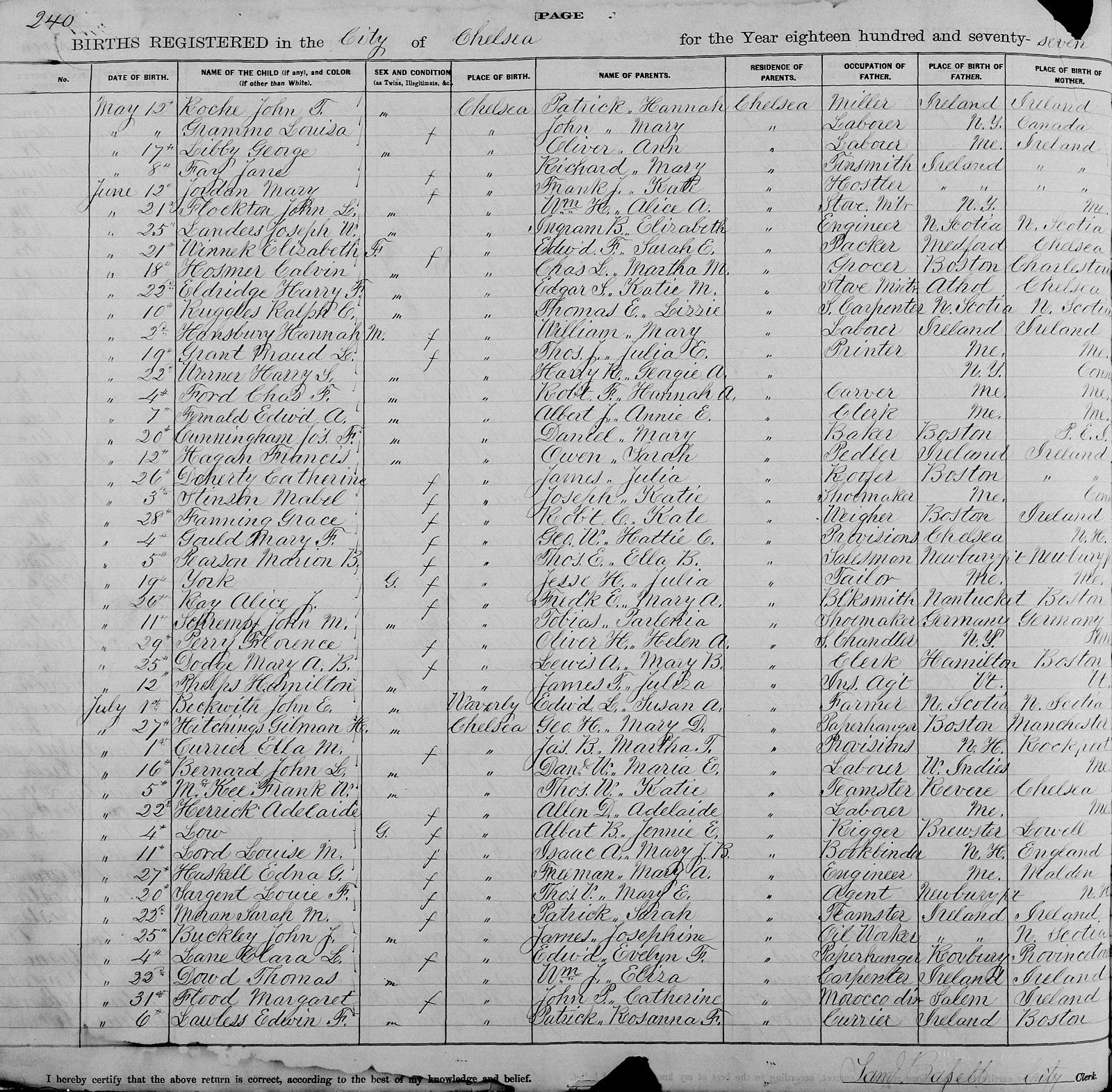 Parents Father: LANDERS, Ingram B. Mother: BANKS, Elizabeth L. Birth Born on June 25, 1877 in Chelsea, Suffolk Co., MA Marriages LANGELL, Devilla DeVere Married on June 14, 1899 in Chelsea, Suffolk Co., MA Children LANDERS, Wallace: June 21, 1900 - June 21, 1900 LANDERS, Beatrice Devilla: July 04, 1902 - March 18, 1986 Notes Occupation: Packer/ Clerk/ Machine Operator Shoe Factory/ Machinist Garment Factory Images Joseph Landers Birth Joseph Landers Marriage