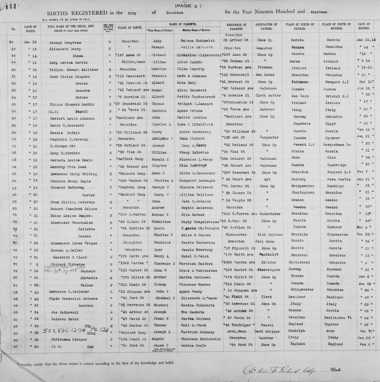 Birth Born on January 20, 1913 in Brockton, Plymouth Co., MA Death Died on April 14, 1968 in Brockton, Plymouth Co., MA Buried in Melrose Cemetery in Brockton, Plymouth Co., MA Marriages BAGNELL, Eleanor Holmes Children HOLMES, Cynthia: 1942 HOLMES, Constance: 1945 - October 05, 1945 HOLMES, Stanford R.: February 06, 1947 HOLMES, Sally: March 19, 1949 - February 13, 2004 Notes Occupation: Salesman/ Route supervisor Brewery Sources Findagrave.com: https://www.findagrave.com/memorial/173296205/robert_stanford-holmes Images Robert Holmes Birth Robert & Eleanor (Bagnell) & Constance Holmes & Sally (Holmes) Palumbo