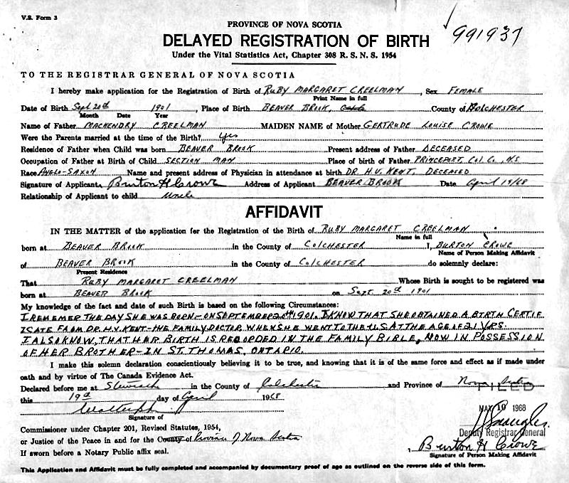 Parents Father: CREELMAN, McKenery Mother: CROWE, Gertrude Louise Birth Born on September 20, 1901 in Beaver Brook, Colchester Co., NS Death Buried in Pioneer Cemetery in Middle Musquodoboit, Halifax Co., NS Marriages GUILD, George William Married on September 09, 1925 in Beaver Brook, Colchester Co., NS Children GUILD, Gertrude Louise - January 10, 2005 GUILD, Ruth Marguerite GUILD, Earl William GUILD, Donald Eugene GUILD, Elmer GUILD, Ralph Kenneth GUILD, Florine Carol Sources Colchester Cemeteries: Pioneer Cemetery, Middle Musquodoboit #325 Images Ruby Creelman Birth Ruby Creelman Marriage