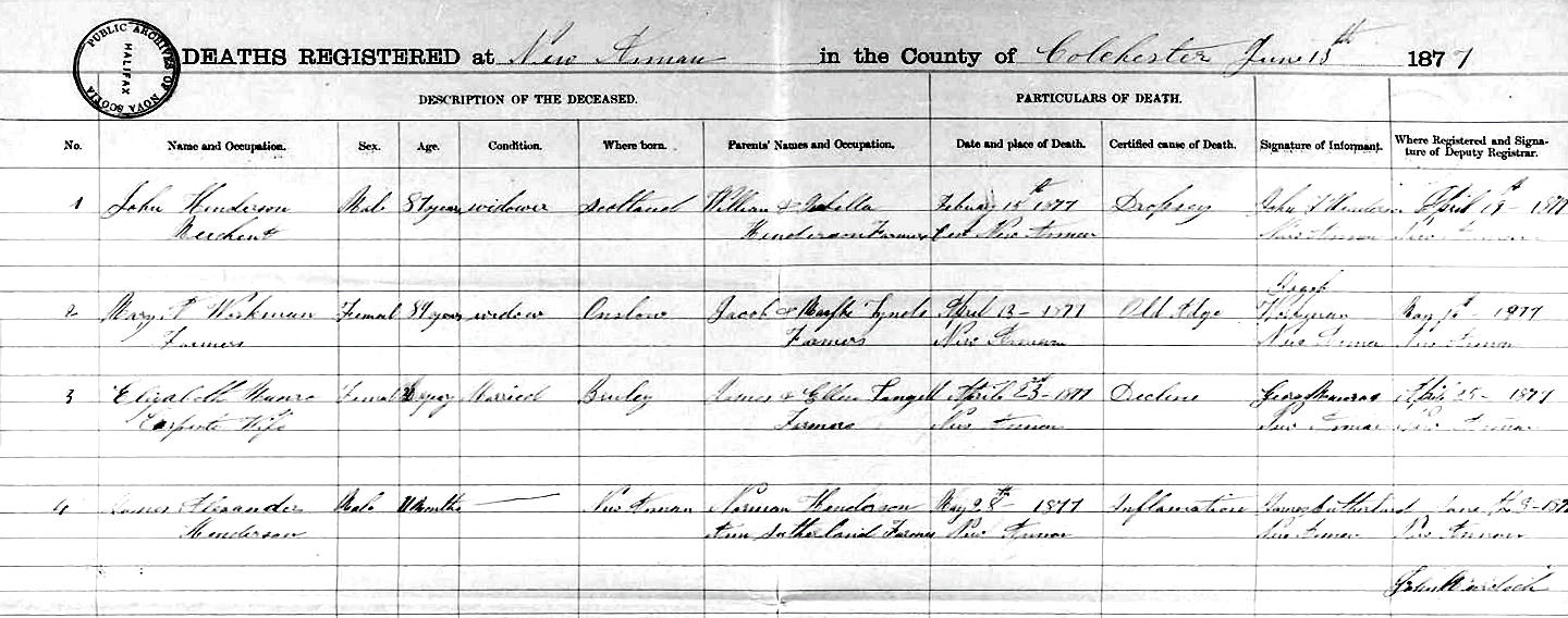 Parents Father: LANGILLE, James L. Mother: LANGILLE, Ellen Birth Born on January 28, 1849 in Brule, Colchester Co., NS Death Died on April 23, 1877 in New Annan, Colchester Co., NS Marriages MUNRO, George Married on January 29, 1877 in Truro, Colchester Co., NS Children MUNRO, James: February 24, 1877 - March 11, 1877 Images Elizabeth (Langille) Munro Death Elizabeth Langille Marriage