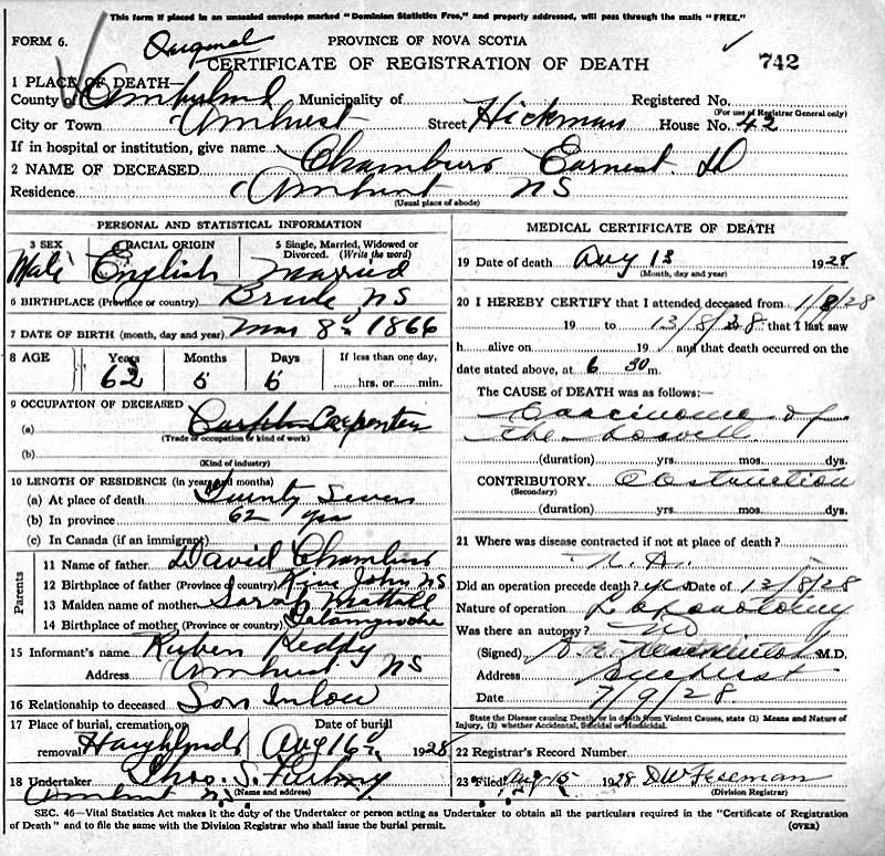 Birth Born on March 07, 1865 in Brule, Colchester Co., NS Death Died on August 13, 1928 in Amherst, Cumberland Co., NS Buried in Highland Cemetery in Amherst, Cumberland Co., NS Marriages LANGILLE, Jemima Ellen Married on August 01, 1888 in River John, Pictou Co., NS Children CHAMBERS, Annie Elizabeth: December 31, 1888 CHAMBERS, Ella May: November 23, 1890 - January 18, 1931 CHAMBERS, Sadie Valetta: September 25, 1893 - April 14, 1985 CHAMBERS, Charles D.: March 27, 1896 - February 25, 1928 CHAMBERS, Margaret Clark: June 25, 1898 Notes Occupation: Farmer/ Carpenter Death: Carcinoma of Bowell Sources Nova Scotia Deaths: Book 120 Pg. 742 Images Ernest Chambers Death Jemima Langille Marriage