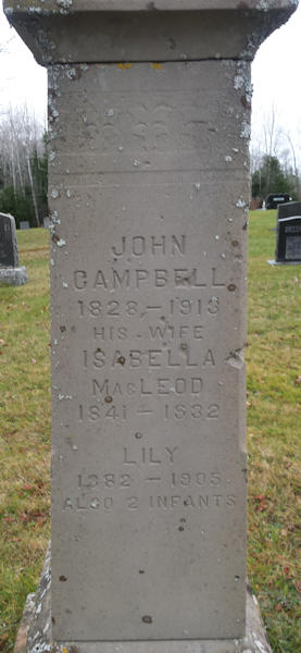Birth Born on March 13, 1828 in Scotsburn, Pictou Co., NS Death Died on October 18, 1913 in Denmark, Colchester Co., NS Buried in Forest Hill Cemetery in Denmark, Colchester Co., NS Marriages MACLEOD, Isabella J. Children CAMPBELL, Martha Anne: April 06, 1864 - March 10, 1948 Notes Occupation: Farmer Death: Old Age Sources Nova Scotia Deaths: Book 4 Pg. 294 #1769 Colchester Cemeteries: Denmark,NS Forest Hill Cemetery #41 Images John & Isabella (MacLeod) Campbell John Campbell Death